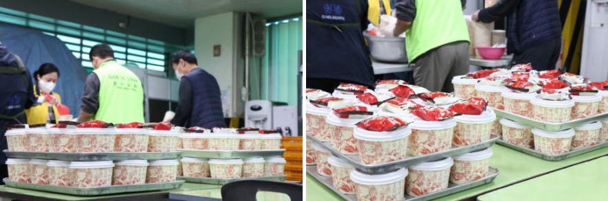 해피기버는 2019년부터 쪽방촌 거주 어르신들을 위해 매년 급식지원을 하고 있습니다. 이번 급식지원은 총 5차례에 걸쳐 쪽방촌 어르신들에게 식사지원을 완료했습니다. 이번 급식지원은 출장뷔페 전용 업체를 이용하여 어르신들에게 신선하고 따뜻한 제육덮밥을 지원할 수 있었는데요. 올해 해피기버의 첫 번째 급식지원에는 해피기버와 아동 청소년 교육사업을 위해 MOU를 맺은 교학사 관계자분들께서 함께해 주셨습니다.