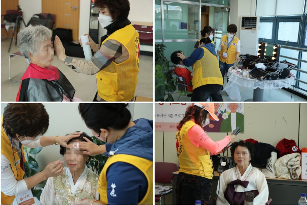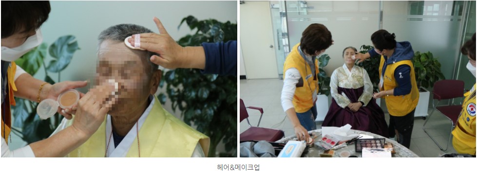 촬영장에 도착한 어르신들은 가장 먼저 접수대에서 접수 후, 한복으로 환복을 도와드렸습니다. 그리고 구리지구협의회 미사랑봉사단(회장:권순녀)로부터 재능을 기부받아 어르신들의 메이크업과 헤어 손질을 도와드렸습니다. 처음에는 오랜만에 입는 한복이 어색하고 쑥스러워 그냥 찍겠다고 하시다가도 막상 한복을 입고 메이크업과 머리 손질까지 하니 기분이 좋아지셨는지 촬영장에서 계시는 내내 입꼬리가 내려가지 않으셨습니다.