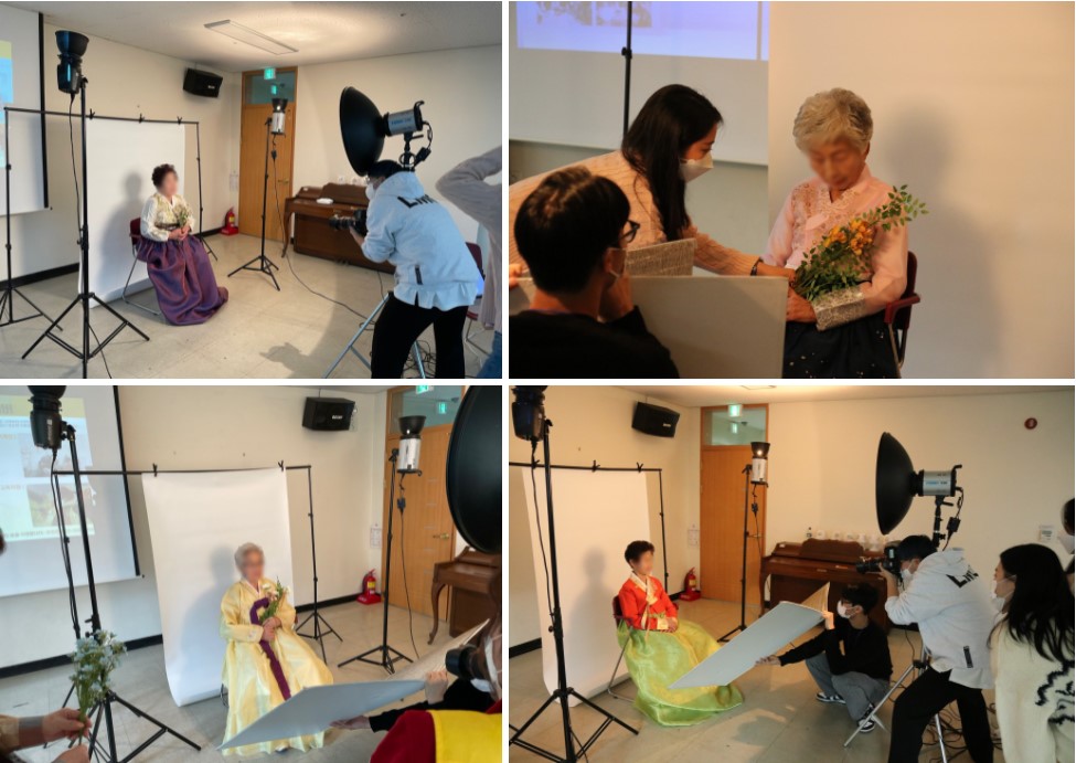 촬영을 기다리시는 동안 지루하지 않도록 말동무가 되어드리고, 카메라가 다소 어색하여 자연스러운 미소가 잘 나오지 않는 어르신들을 위해 손주 녀석 같은 스테프들이 앞에서 재간 부리듯 김치~!를 외치자 어르신들께서도 금세 함박웃음을 보이셨습니다.