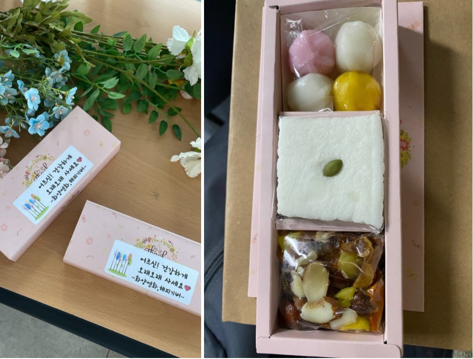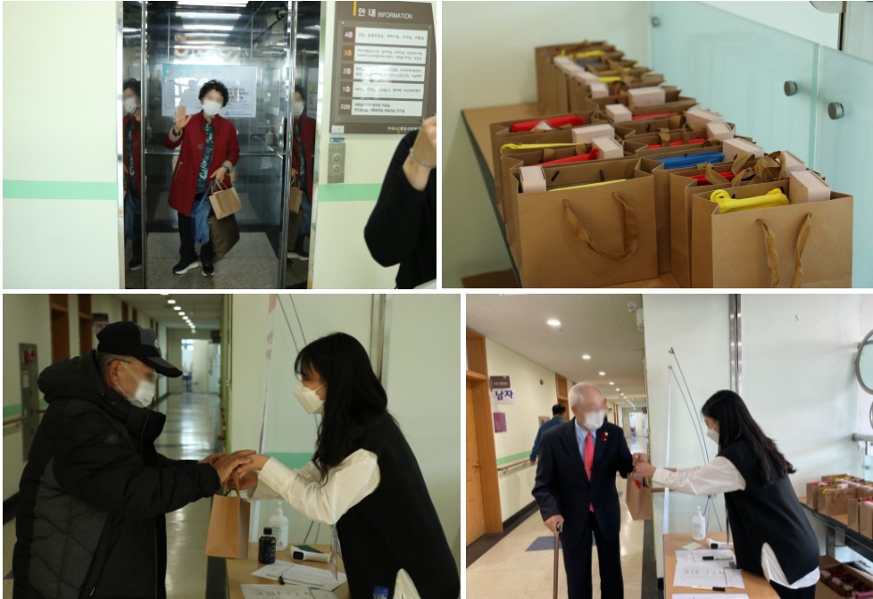 촬영이 끝나고 집으로 돌아가시는 어르신들에게 해피기버는 작은 선물을 준비했습니다. 코로나19로 촬영장 내 취식이 불가능해 어르신들께 마실 것조차 제대로 챙겨드리지 못하는 죄송한 마음과 춥고 쌀쌀한 날씨에 멀리서부터 찾아와주신 어르신들께 감사를 전하고자 당일 오전 만들어진 맛있는 떡 세트와 식혜 그리고 코로나19로부터 어르신들을 지켜줄 해피기버 후원자분들이 직접 만든 마스크과 손 세정제를 전달해드렸습니다.