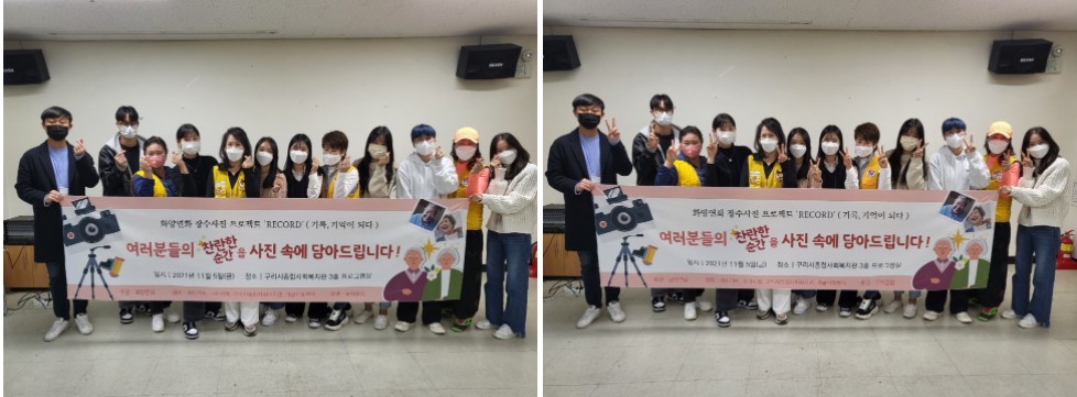 2021년 11월 5일 금요일 구리시 종합사회복지관에서는 어르신들의 찬란한 순간을 담기 위한 장수사진촬영 행사가 진행되었습니다. 이날 행사에는 해피기버와 구리시 종합사회복지관 직원들, 그리고 화양연화 팀원들이 모두 참석하여 어르신들께서 순조롭게 촬영을 하실 수 있도록 도왔습니다. 촬영은 전문 스튜디오를 초정하였으며, 혹시라도 한복이 없거나 촬영 준비가 어려우신 어르신들을 위해 촬영장에는 헤어&메이크업을 도와줄 봉사자와 고운 한복까지 준비해 두었습니다.