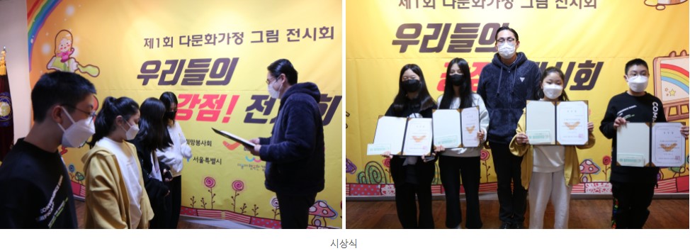 글로벌한문화희망봉사회센터를 이용하는 다문화가정의 아이들이 그동안 그리고 만들어온 미술작품들을 한곳에 모아서 전시하는 ‘우리들의 강점!‘ 전시회는 12월 14일 ~ 17일까지 4일간 이루어졌으며 시상식은 14일 오후 4시에 진행되었습니다. 이날 해피기버 조범석 과장님께서 홍사범이사장님 대신 참석하셔서 상장을 수여했습니다. 해피기버는 이번 전시회 시상식을 위해 상금과 장소 대관비를 지원하여 아이들에게 특별한 추억을 선물했습니다.