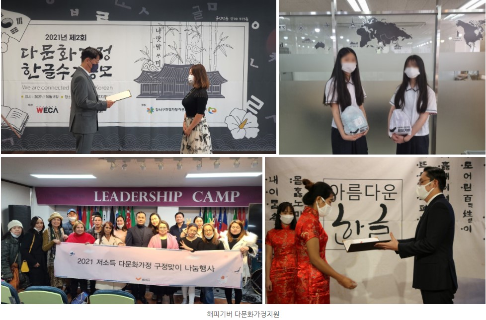 해피기버는 다문화 가정 지원을 통해 다문화가정이 건강한 가족의 형태로 자리 잡을 수 있도록 힘쓰고 있습니다. 특히 다문화가정의 아이들은 다소 다른 생김새, 두 개의 모국어 등 다른 가정의 아이들과는 조금 다르다는 이유로 따돌림을 당하거나, 그로 인해 성격이 쾌활하지 못하고 주눅이 들어있는 경우가 많습니다. 해피기버는 다문화가정의 아이들이 차별받지 않고 당당한 대한민국의 한 국민으로 자리 잡을 수 있도록 심리 및 언어 치료비를 지원하고 다양한 문화 프로그램과 공모전을 개최하여 아이들이 자존감을 회복하고 자신감을 얻을 수 있도록 노력하고 있습니다. 또한 이러한 차별들로 인해 직장을 구하기 어려워 심각한 빈부격차를 겪고 있는 이주여성들에게는 식료품, 생리대, 교육 프로그램 등을 지원하여 대한민국에 잘 정착할 수 있도록 돕고있습니다. 다문화가정 지원에 함께해주신 해피기버 후원자님들께 감사의 말씀을 드립니다.