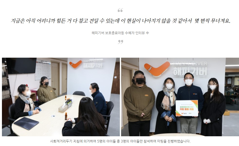 해피기버는 안양의 집을 퇴소한 보호종료아동을 직접 만나 ‘홀로서기‘의 고충을 들어보았습니다. "퇴소를 앞두고 10년 넘게 보육원 친구들과 함께 살다가 드디어 혼자 산다고 생각하니까 너무 좋고 기뻤어요. 하지만 막상 나와보니까 아무것도 할 수 있는 게 없더라고요. 보일러를 작동하는 방법, 세탁기에 세제를 얼마큼 넣어야 하는지, 전구를 교체하는 방법 등 이런 사소한 것들조차 어떻게 하는지 몰라서 혼자 할 수 없었어요. 텅 빈 집도 채워야 하는데 흔한 청소기나 식기류조차 살 돈이 없어서 다0소에서 빗자루를 사서 청소를 하고 필요한 식기를 샀어요"