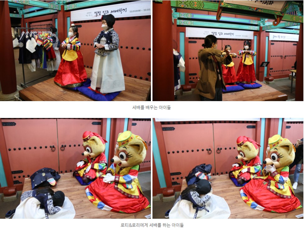 역사교육이 끝난 후 아이들은 우리나라의 전통 옷 ‘설빔‘을 입고 세배를 배우고, 원하는 색의 복주머니를 만들어보는 체험을 진행했습니다. 이날 롯데월드에서는 아이들을 위해 특별 게스트를 초청해 주셨는데요. 롯데월드의 마스코트 로티와 로리가 방문하여 아이들의 체험 현장에 함께했습니다.