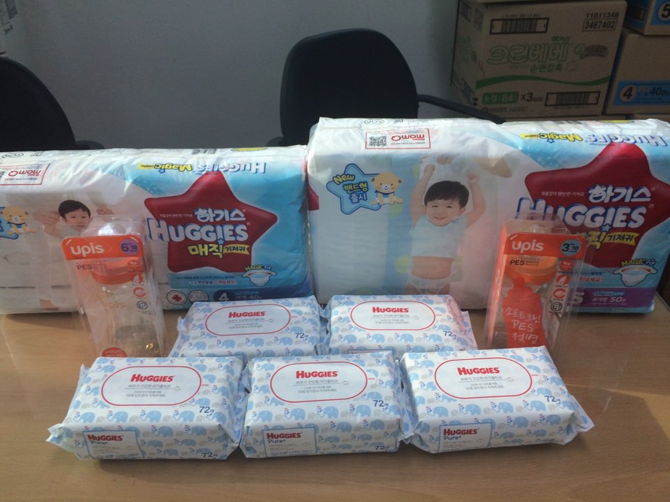 기저귀 12팩, 젖병, 젖꼭지 3묶음, 물티슈 20팩