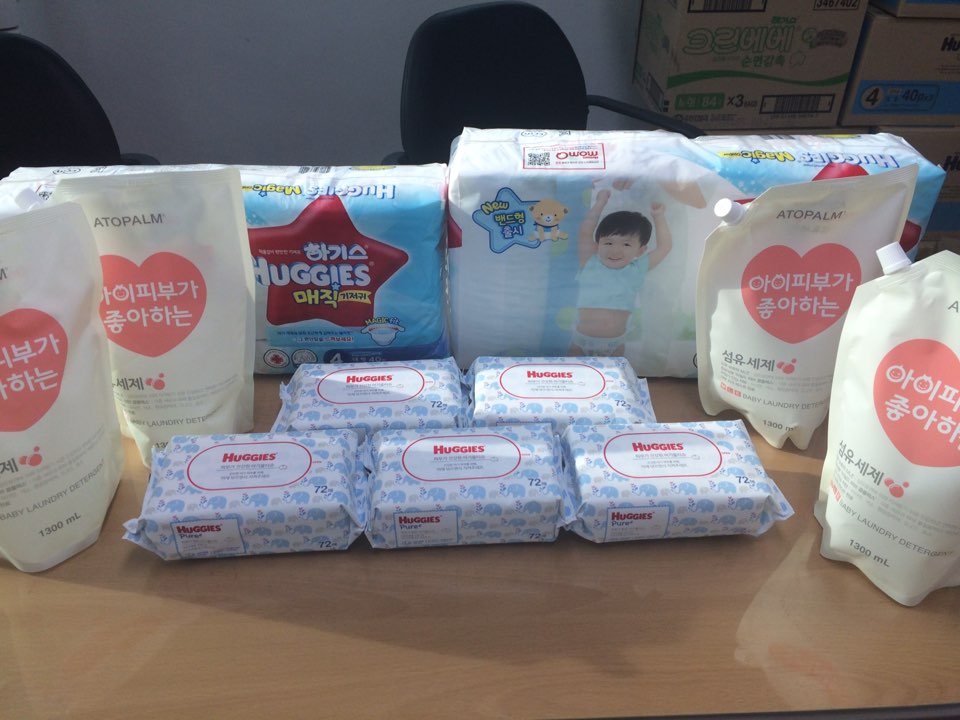 기저귀 3팩, 물티슈 10팩, 유아용세제 10팩