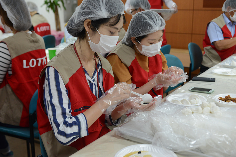 롯데알미늄 임직원이 추석을 맞아 홀몸 어르신들에게 전달할 송편만들기 진행