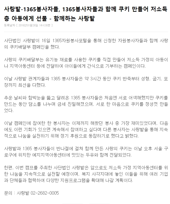 [언론보도] 사랑밭, 1365 봉사자들과 함께 쿠키 만들어 저소득층 아동에게 선물