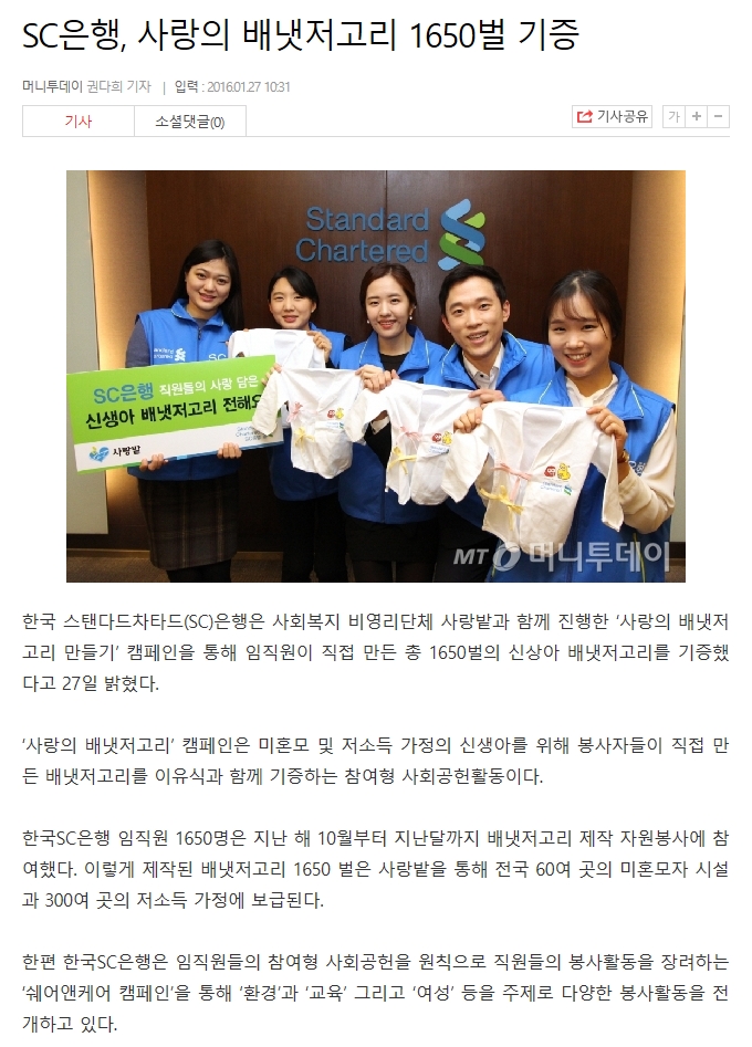[언론보도] SC은행, 사랑의 배냇저고리 1,650벌 기증