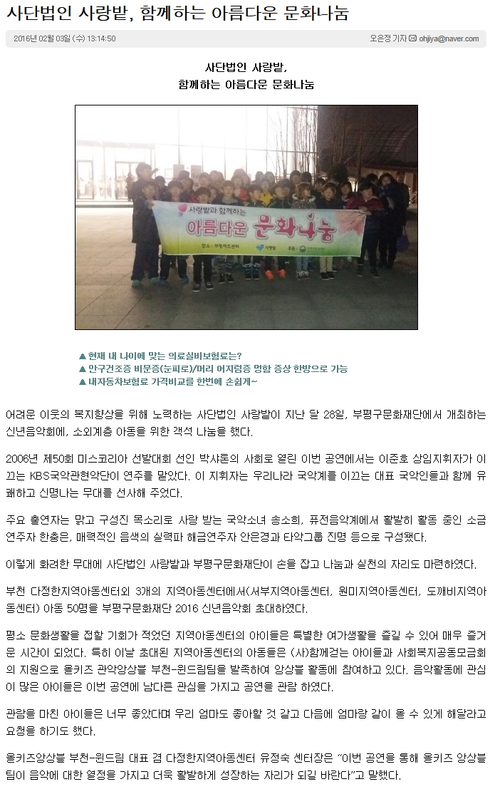 [언론보도] 사단법인 사랑밭, 함께하는 아름다운 문화나눔