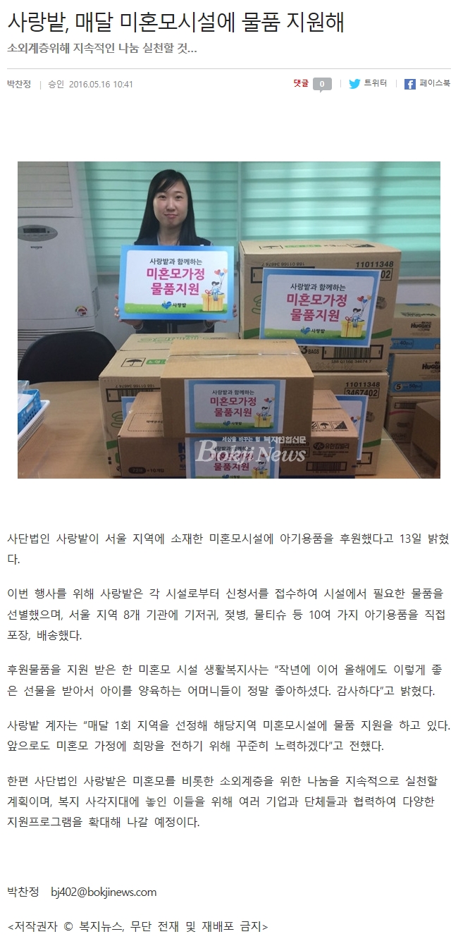[언론보도] 사랑밭, 매달 미혼모시설에 물품 지원해