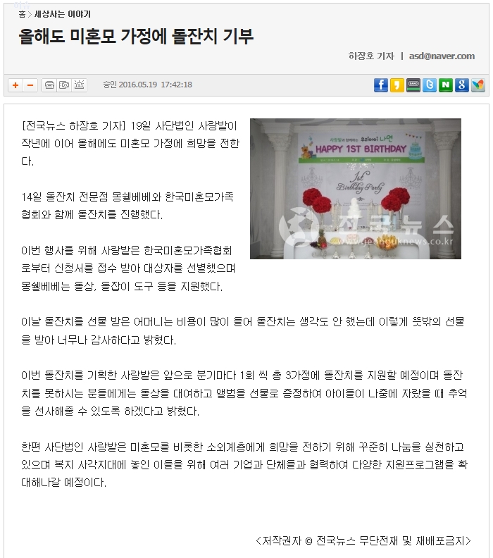 [언론보도] 올해도 미혼모 가정에 돌잔치 기부