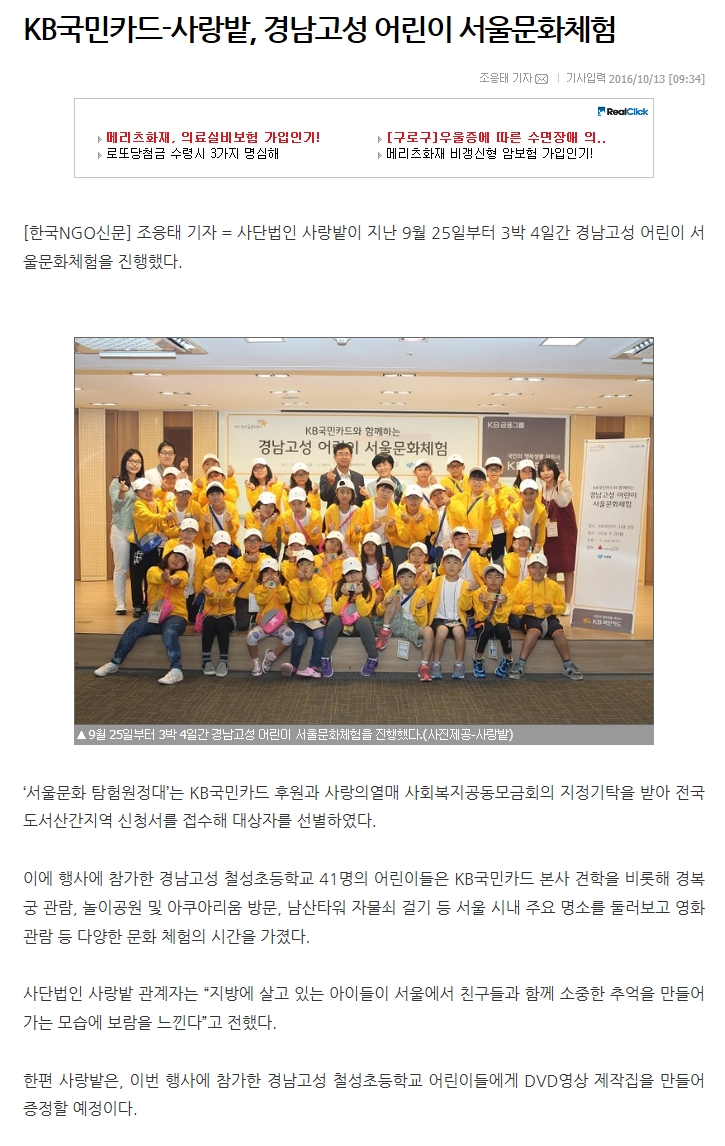 [언론보도] KB국민카드-사랑밭, 경남고성 어린이 서울문화체험
