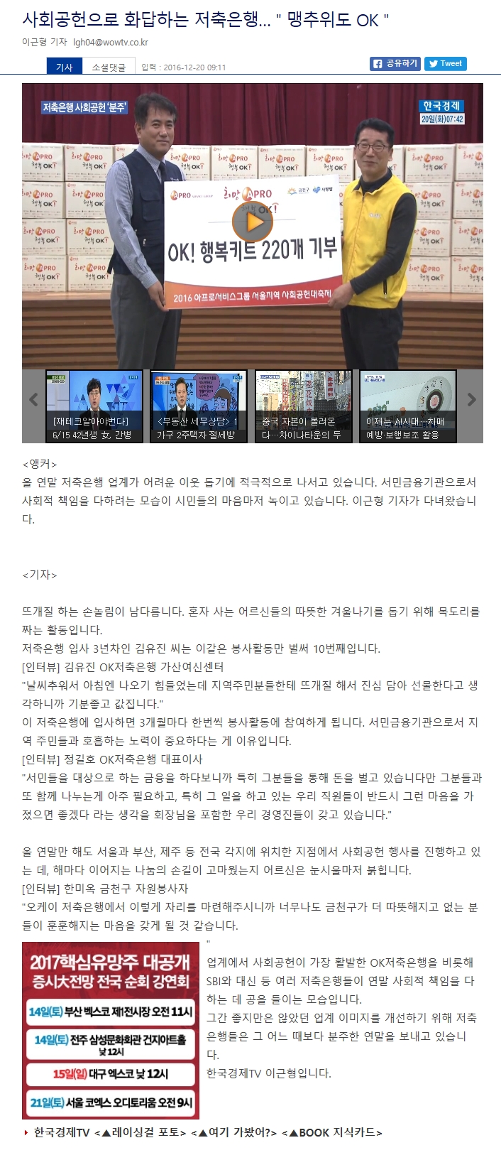 [언론보도] 사회공헌으로 화답하는 저축은행