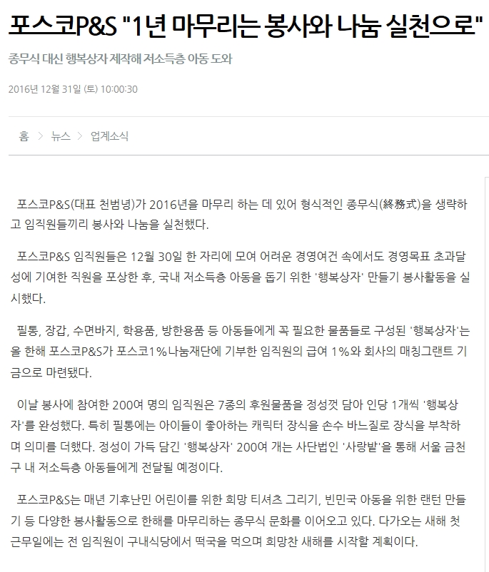[언론보도] 포스코P&S "1년 마무리는 봉사와 나눔 실천으로"