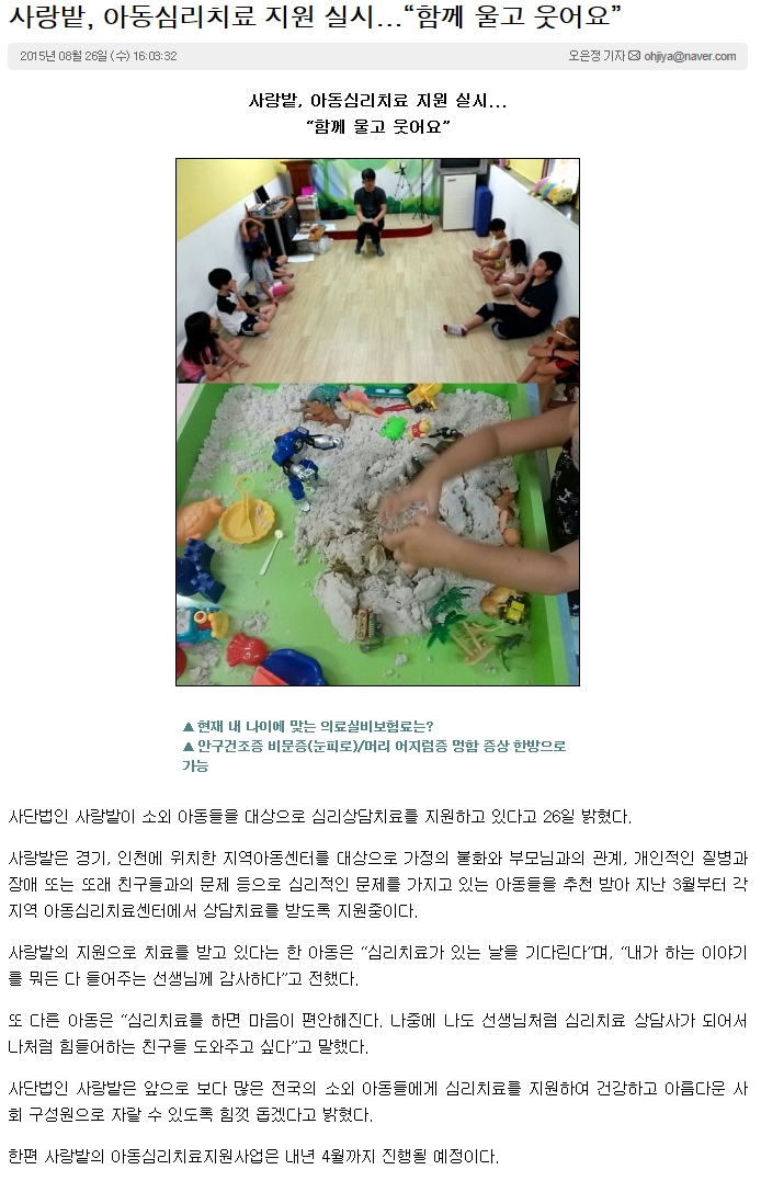 [언론보도] 사랑밭, 아동심리치료 지원 실시...