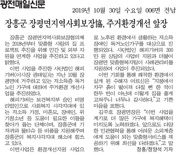 [언론보도]장흥군 장평면지역사회보장, 주거환경개선 앞장(해피기버)